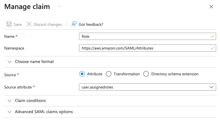 7. Enter `Role` under **Name** and `https://aws.amazon.com/SAML/Attributes` under **Namespace**. Select `Attribute` **Source** and `user.assignedroles` **Source attribute**. Click **Save**.