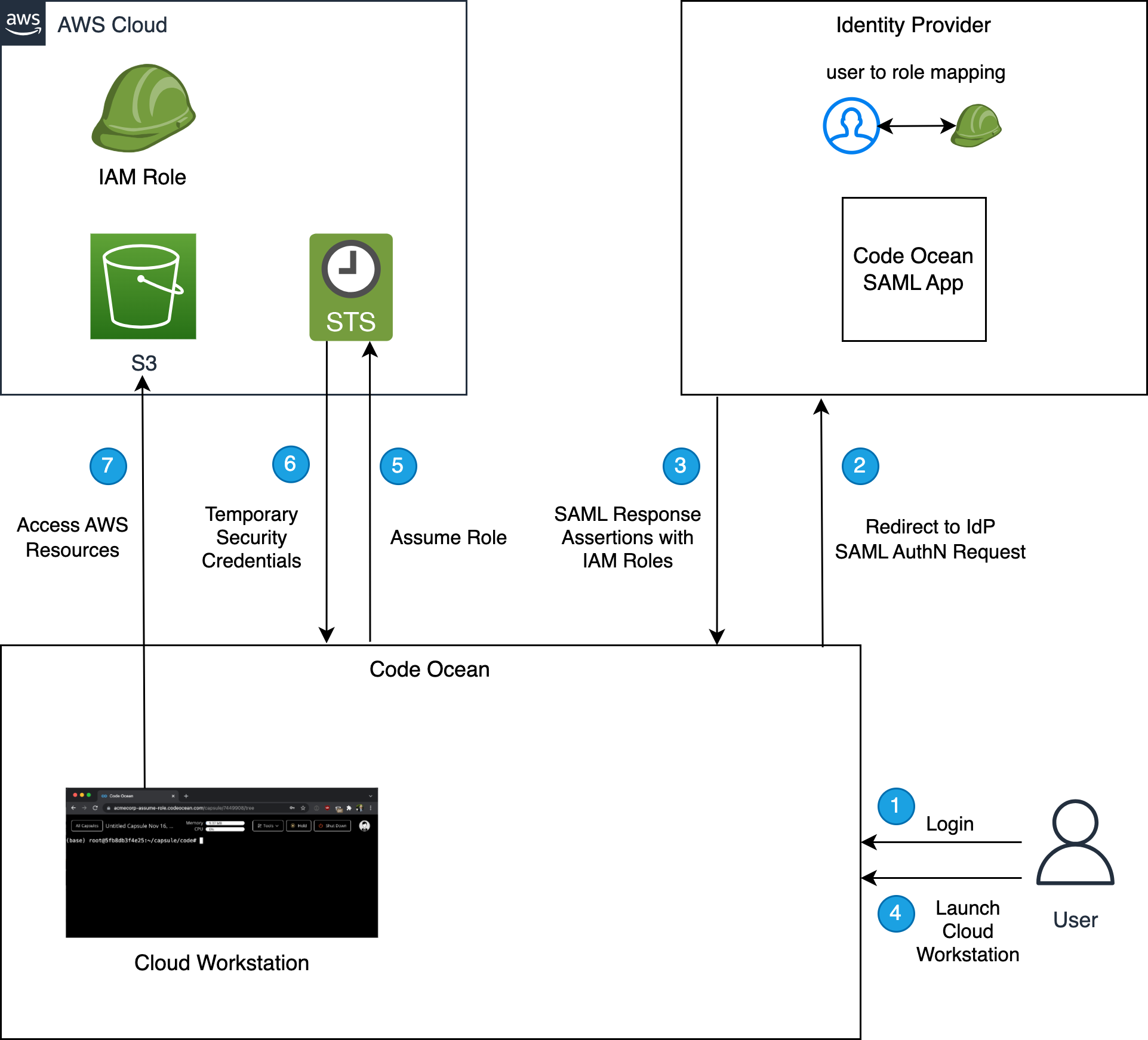 Code Ocean AWS Assumable Roles allows administrators to assign IAM roles to Code Ocean users through SAML SSO integration with their identity provider (IdP). After creating IAM roles in AWS, admins allow Code Ocean to assume these roles on behalf of users. Finally, through SAML assertions, admins map identity provider users and groups to IAM roles. Users can then assume their assigned IAM roles in capsule and pipeline runs.