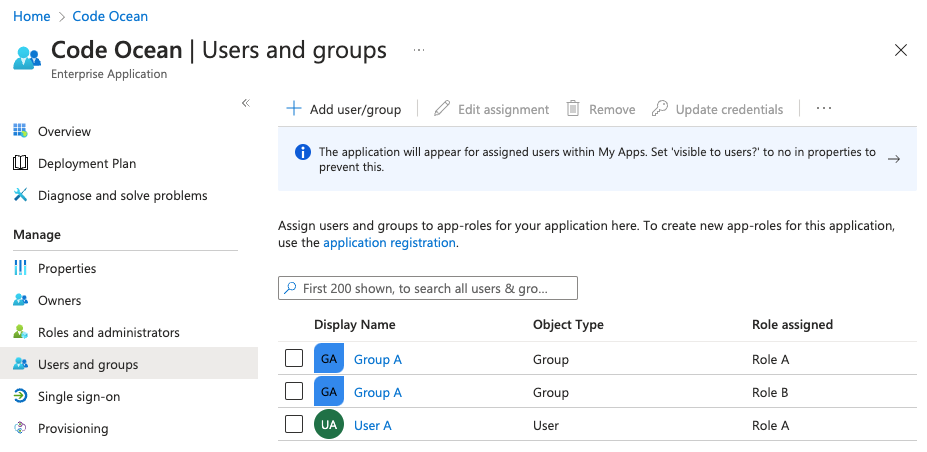 8. Go back to the Code Ocean enterprise application -> **Users and groups** and assign app roles to users and groups. You can assign multiple IAM roles to users or groups by assigning several app roles to the same user or group.