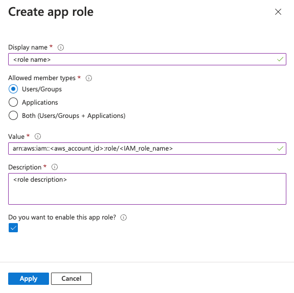 3. Go to **App roles** and click on **Create app role**. Fill in the app role display name and description. Under **Allowed member types** select **Users/Groups**. Fill in the IAM role ARN under **Value** and click **Apply**.